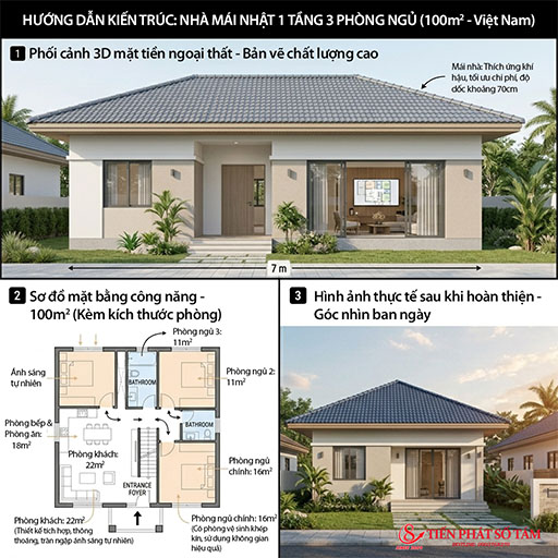 1. Nhà cấp 4 mái Nhật 3 phòng ngủ – Lựa chọn phổ biến nhất