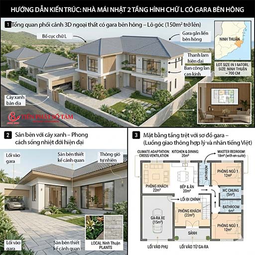 4. Nhà 2 tầng mái Nhật chữ L có gara – Phù hợp đất 2 mặt thoáng