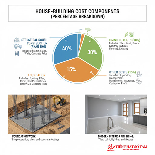 Gợi ý hình ảnh: biểu đồ bánh % phân bổ, ảnh thi công móng, ảnh hoàn thiện nội thất.