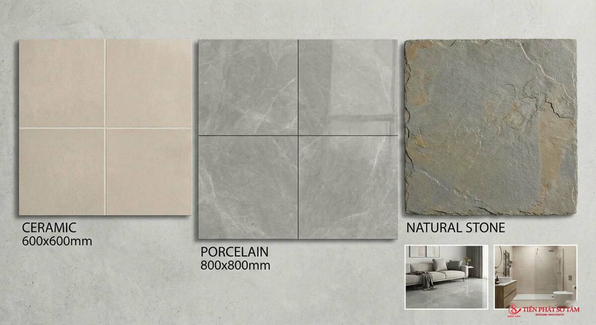 - Lựa chọn vật liệu: gạch ceramic (kinh tế), porcelain (cao cấp), đá tự nhiên (đắt).
