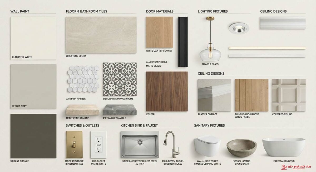 - Lựa chọn bộ thiết bị vệ sinh: từ bộ cơ bản 3–4 triệu → bộ cao cấp 20–30 triệu.