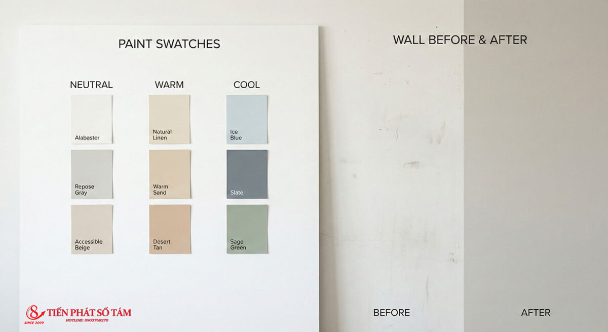 - Mẹo tiết kiệm: sử dụng sơn khu vực ẩm ướt là loại chống ẩm, các vị trí không tiếp xúc trực tiếp dùng sơn phổ thông; tận dụng màu trung tính để dễ bảo trì.