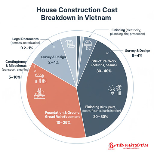 • Hoàn thiện (ốp lát, sơn, cửa, thiết bị, nội thất cơ bản): 20–30%.