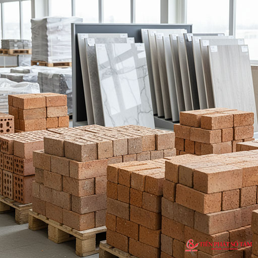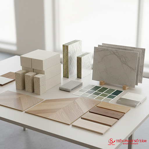 Gợi ý ảnh: moodboard vật liệu xanh, gạch nhẹ, panel cách nhiệt.