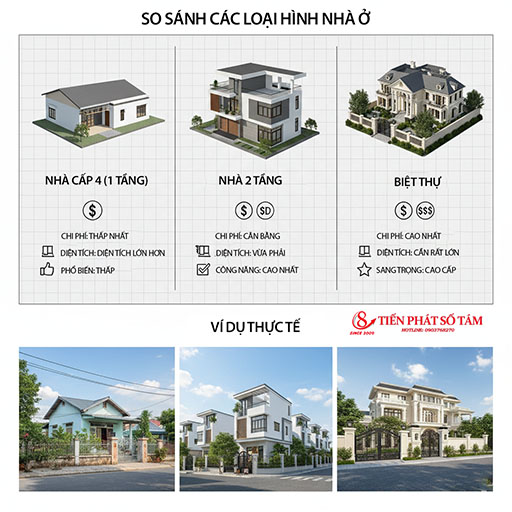 | Tiêu chí | Nhà cấp 4 | Nhà 2 tầng | Biệt thự |