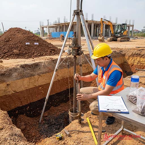 • Khoan 2–4 lỗ khảo sát tùy diện tích; lấy mẫu, test SPT, nén, xác định mực nước ngầm.