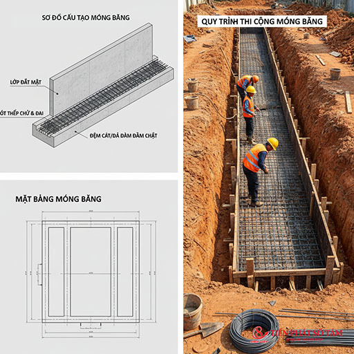 Mô tả: Dải móng liên tục dưới tường chịu lực — thường dùng cho nhà phố, nhà 2–3 tầng.