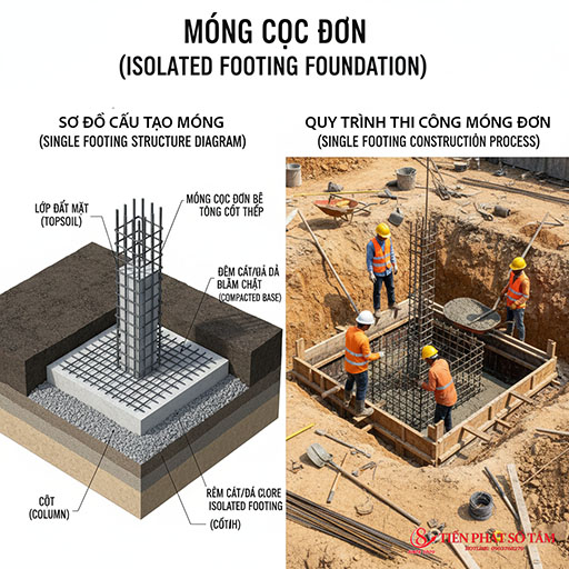 Mô tả: Móng đơn là móng đặt dưới từng cột riêng lẻ, thường ở nhà nhỏ, nhà cấp 4, nhà ống nhẹ.