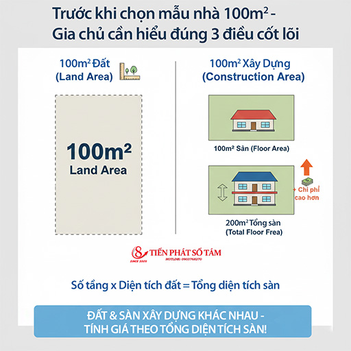 - 100m² xây dựng → tổng diện tích sàn (đã nhân tầng)